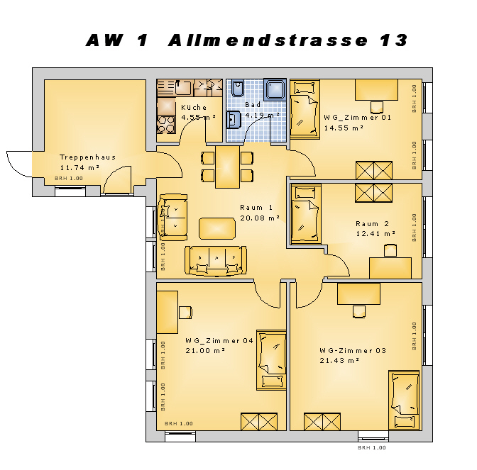 Die Wohnung AW1 ist eine vierer -WG in einer Fünfzimmerwohnung von 98m²
